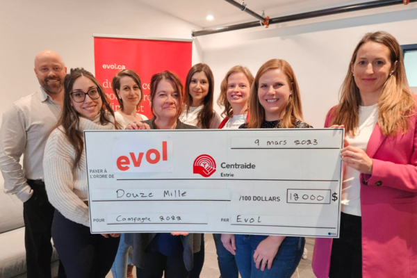 Le 14 mars dernier, des employé·es d’Evol, réunis à Sherbrooke pour l’occasion, ont eu l’honneur de remettre un magnifique don de 12 000 $ à Centraide.